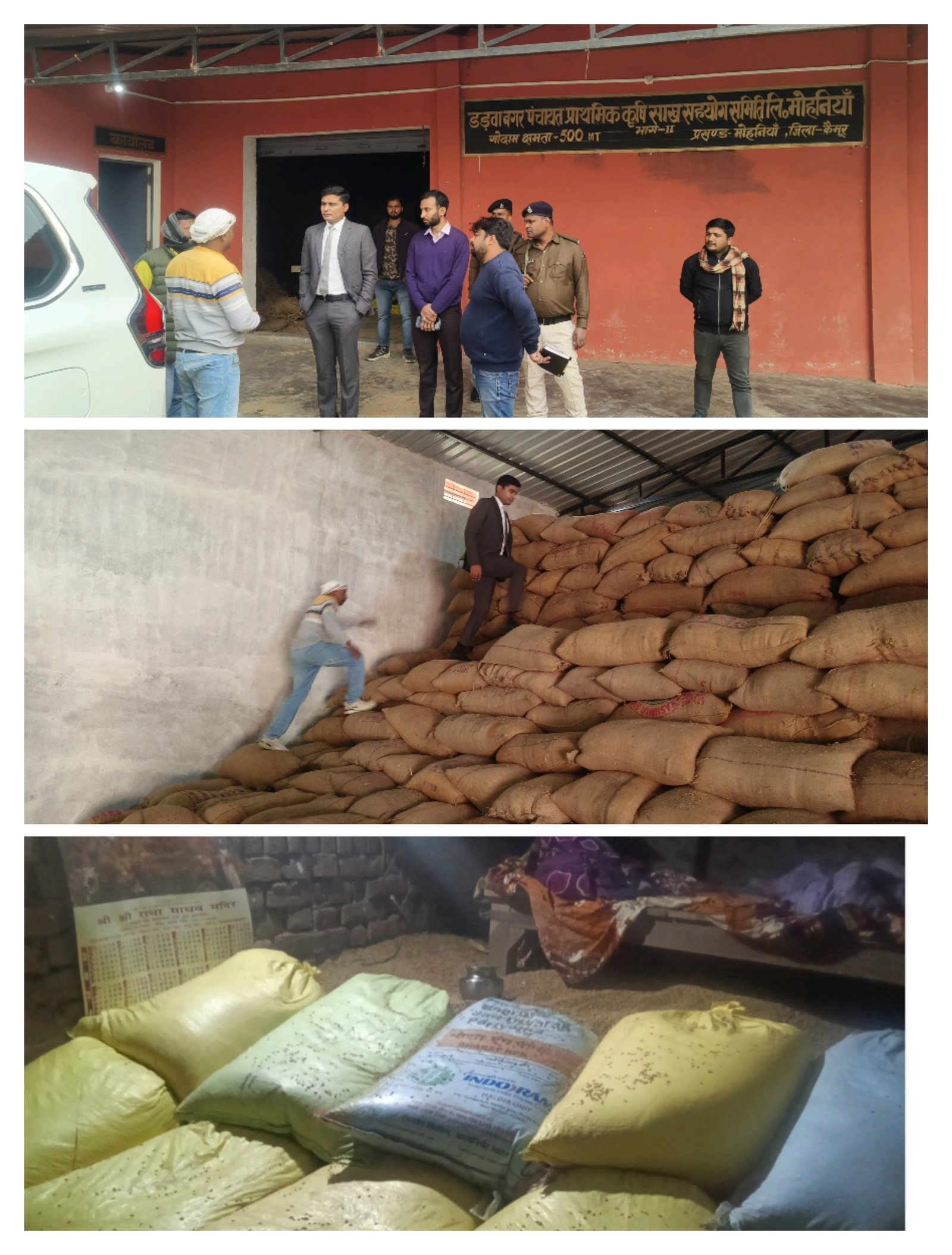 कैमूर-- जिले में धान अधिप्राप्ति और भंडारण व्यवस्था को चुस्त-दुरुस्त रखने के लिए जिला प्रशासन पूरी तरह दिखावे में सख्त नजर आ रहा है। जिला पदाधिकारी के कड़े निर्देकों का तथाकथित पालन करते हुए, सोमवार को उप विकास आयुक्त (डीडीसी) सूर्य प्रताप सिंह ने मोहनियां प्रखंड के डड़वा स्थित नगर पंचायत पैक्स गोदाम का औचक निरीक्षण किया।
